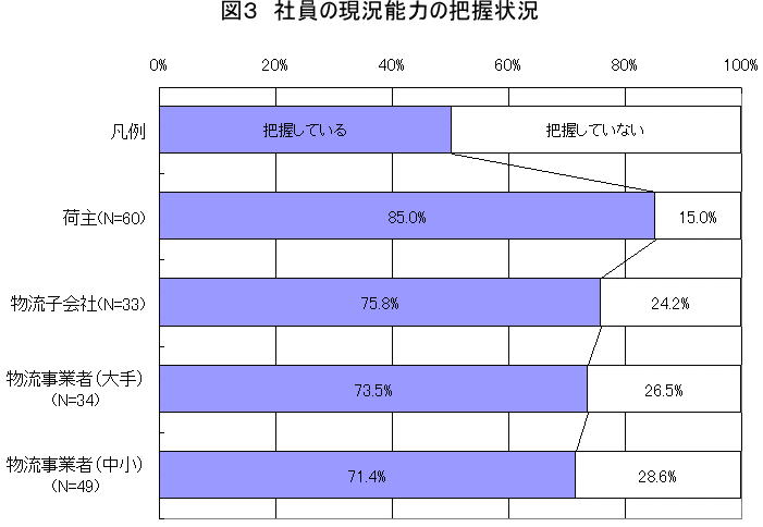 図3は、社員の現況能力の把握状況について示した図である。荷主企業で社員の能力を把握している企業の比率が85%と高くなっているが、これは、物流事業者と比較して、物流・ロジスティクス業務に携わる社員数が少ないためである。一方、物流子会社や物流事業者の約1/4が「把握していない」としているが、アンケート後のヒアリング調査では、「レベル感ぐらいは把握している」と回答する企業が多かった。