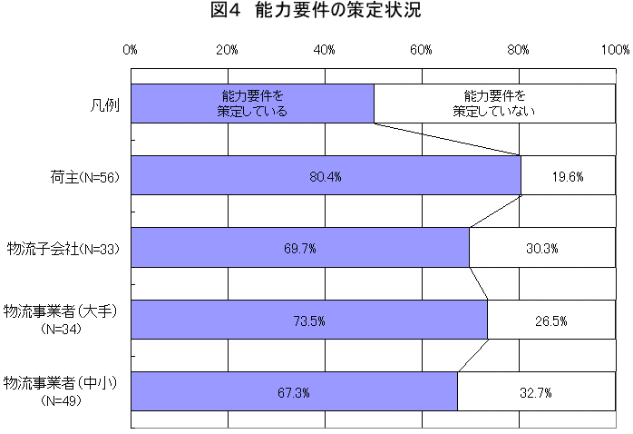 図4は、能力要件の策定状況について示した図である。傾向は、現況能力の把握状況と類似しているが、比率は若干下回る。ヒアリング調査では、能力要件までは策定していないが、「これぐらいのレベルであって欲しい」というレベル感(目安)は持っている、と回答する企業が多かった。