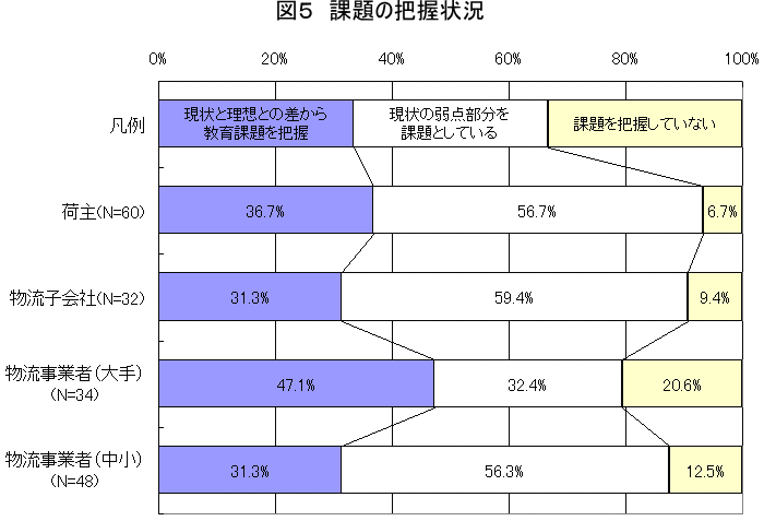 図5は、課題の把握状況と、把握方法について示した図である。荷主企業、物流子会社、中小の物流事業者では9割前後の企業が課題を把握できているが、大手の物流事業者では8割である。これは物流やロジスティクスに携わる社員数が多いことに合わせ、業務領域が広く、かつ、各物流現場に特有の業務がある等の理由で、社員個々の課題を細かく把握しきれていない状況が現れている。