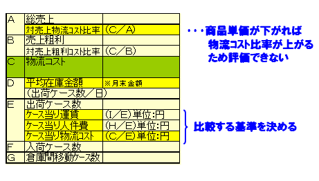 デフレの経済環境下で、同一商品の商品単価が10%程度下落したとしよう。これを前年同月対比で比較をすれば、決算時の売上金額が前年とほぼ同等の場合でも、出荷ケース数が10%前後増加し、発注が更に細かくなるため出荷行数も同様に多くなる可能性が高い。物流コスト管理を実施していない会社は、社長から物流担当の役員に「営業が頑張って売上高を維持しているのに物流部門は物流コストを増加させて足を引っ張っている!」と怒鳴られても反論ができない。物流コスト管理をしている会社は、1ケース当りの売上金額の増減を掴んだ上で、1ケース当りの人件費(1行当りの人件費でも可能)等で前年と比較をして物流コスト増加の原因が説明できる。前者と後者では、経営判断も変わってくるし、物流側のモチベーションも大きく違う。物流は「通常に出荷するのは当たり前、褒められることなど無い」とよく言われる。物流も営業と同様、物流改善予算を持って、改善を推進できれば評価される様な企業環境を整備する必要があると思う。