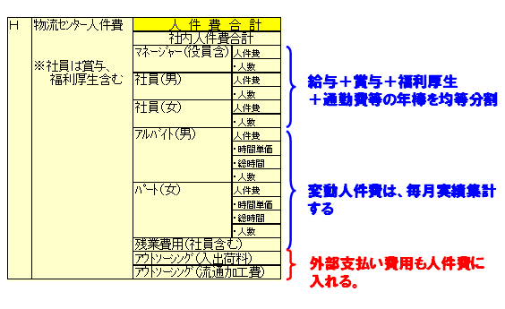 少し面倒な事かもしれないが、これが実現できれば、「社員1人とパート1人の人件費の比較」、「残業の見える化」、「物量の変動と人件費の比較」ができる様になる。自社物流をアウトソーシングに出した場合でも、その効果がはっきりと見えてくる。上記の人件費には、社内の物流支援費用も勿論計算に入れなければならない。繁忙期には営業が手伝うこともあるかもしれない。社員が手伝うのは無料では無い。これを見える化すれば、支援時間を削減しようとする考え方が出てくるものである。