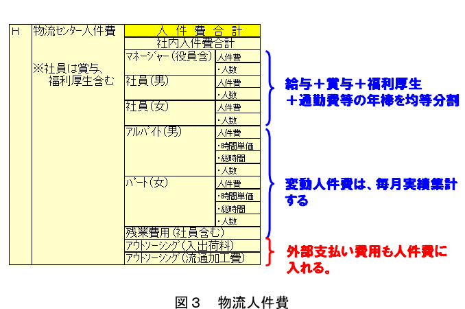 物流会計にはいくつかのルールがある。「売上・物量と支払い経費の締め日の統一」と、「社員人件費の年間均等分割」の検討が必要になる。そもそも物流会計は、管理会計と違い、発生月にコスト計上してはいけない。管理会計では6月と12月に社員のボーナスが増加されるが、「今月は賞与月なので売上金額に5%加算させて頂きます」と得意先にお願いするのは実際ありえない。よって、過去の実績に伴って、将来的なボーナスも考慮した上で、社員1人毎の年間支給額を算出してから年間均等割りにする必要がある。しかし、残業費、アウトソーシング等の月別の変動費に関しては、物流コストは発生月につけることになる。(図3)