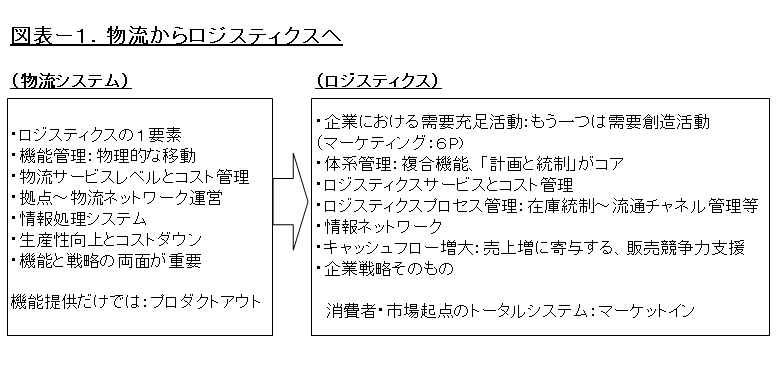 全ての企業活動は顧客が誰で、何をどの位求めているかを調査し、それを商品というかたちに具現化し市場に供給していく。前者の活動がマーケティングであり、いわば需要を創造する行為である。後者がロジスティクスであり、これは需要を充足する活動である。この二つがビジネスモデルの根幹であり、どちらが上位でどちらが下位という関係ではない。あくまで車の両輪である。所が最近では企業のコアは前者であり、後者はアウトソーシングという風潮である。ロジスティクスの骨格ができてその実務をアウトソーシングするならまだしも、フルアウトソーシングというのは頂けない。