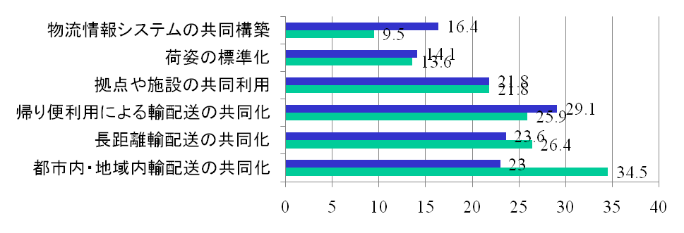 ●荷物や車両の融通・・・共同配送・共同保管、荷姿の標準化などの連携