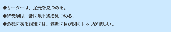 まず、リーダーは、前述のごとく、目配り・気配り・心配りができるこ と。実務リーダーの条件として組織内の従業員に主役の場を与えること、 実務現場の目線に立つこと、社内や過去の常識にとらわれないこと、リー ダーとしてぶれない(常に変わらぬ信念を・・・)こと、自分の足で確認をす ることが肝要であります。