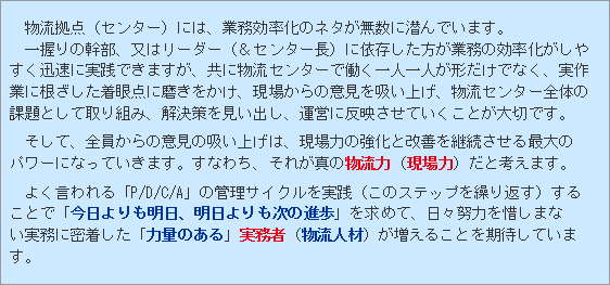 ねじ卸(取り扱い点数40万点)で営業&物流現場出身の所長兼物 流センター長が、自身の実務経験を存分に生かし、管理職の立場になっても「物流現場の目線」で約360人もいる作業員の心理を自ら に映し、意思決定を下すように心がけていました。センター長は、常に「管理職にとって部下はお客様」と考えていました。