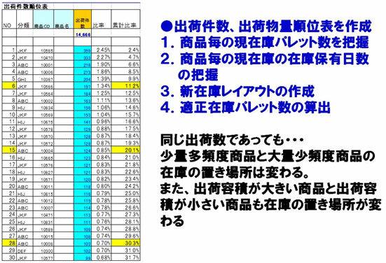 在庫配置時に考慮しなければならない事がいくつもあることがわかったが、在庫を置く順番は人間の勘ではどうしようもない。良くでる商品と言っても、同じ数量でも、1000個を1回で出荷する場合と20個を50回出荷する場合とでは大きく違うのである。また、10000個でも1ケースの商品もあれば、50ケースの商品もある。それを正確に分析するにはデータ化が必要になる。