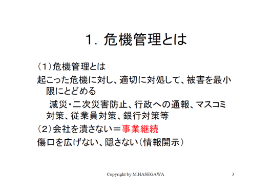 まず危機管理ですが、私なりに思っていることですが、これは既に起こってしまったことに対して被害をどのように最小限にとどめるかということです。今新聞で話題になっている製紙メーカーさん、精密機器メーカーさんがありますが、一つ大きな事が起こった時に、従業員に対してどのように説明するか、あるいは小さな会社であれば銀行対策をどのようにするかということですね。