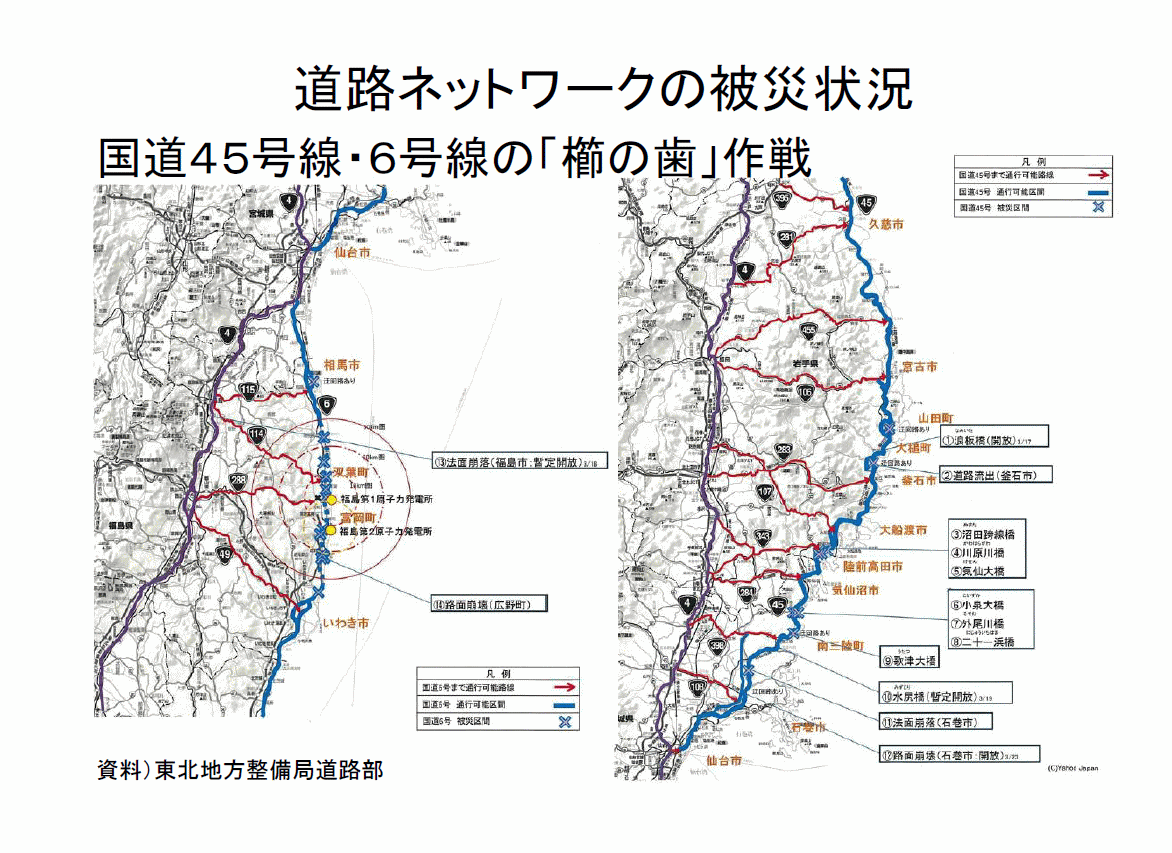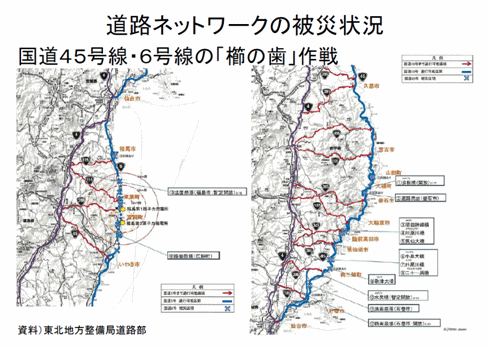 それからこのような内陸から海岸に出る17本ある道路です。「櫛の歯作戦」ということで優先的に復旧工事を行ったのです。これにより、緊急支援物資あるいは量販店さんへの食料や日用品などの供給を出来るようにしたのです。