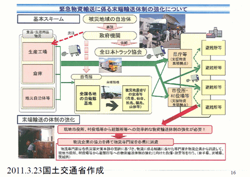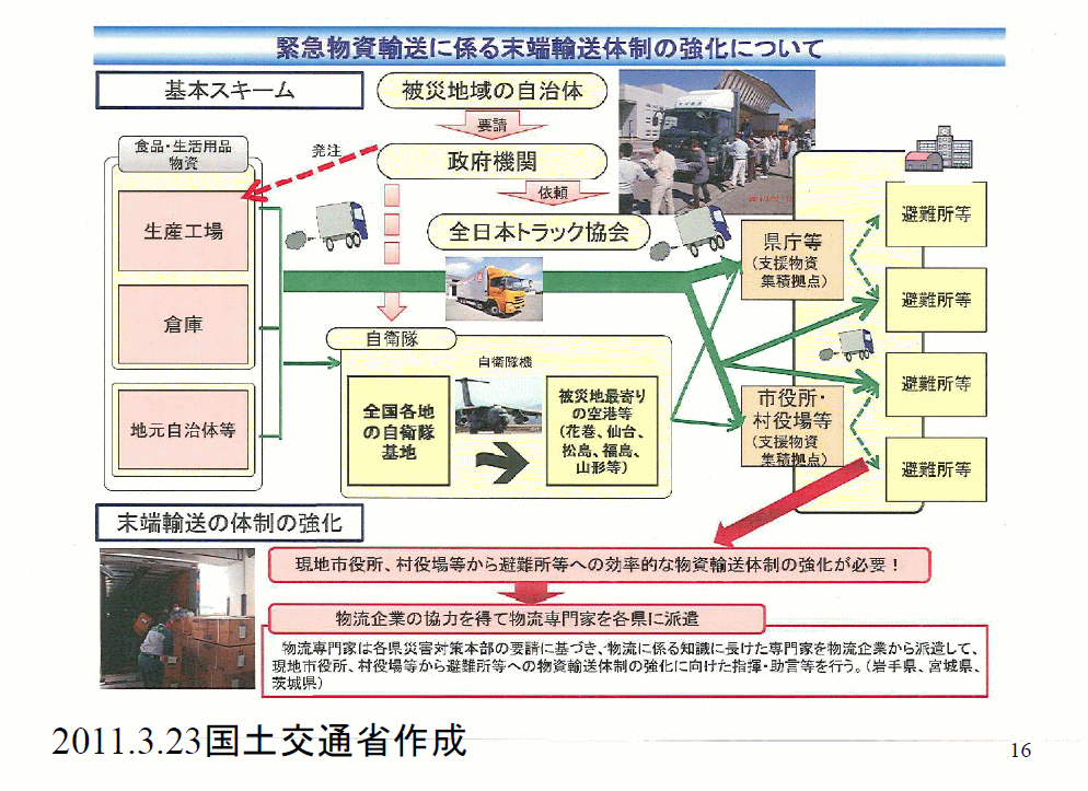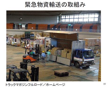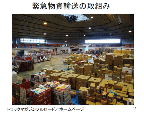 「餅は餅屋」ではありませんが、トラック会社だとか倉庫会社が拠点を貸して、そこで物流作業、在庫管理をし、荷受して商品を台帳につけてそれを各被災地からの救援要請に応じて、水が何本毛布が何枚出荷、そういったことをやっていくようになって初めてうまく緊急支援物資が流れるようになったのです。