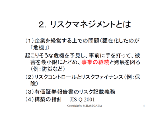 リスクマネジメントについて、これは今これからどんな事が、会社経営の中でリスクがあるかと言うことです。起こってしまったもの、顕在化してしまったものが危機となるのですが、そのことを予測して事前に手を打ち被害ができるだけ少なくなるようにすること、例えばこれからお話しする防災とはそういう事です。ここで重要な点は、事業の発展継続だとかそれに関連する事も入ってくるということです。
