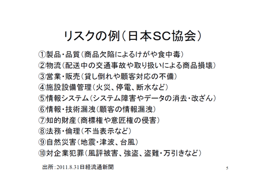 リスクの例としては、これは今年の8月31日の日経流通新聞に出ていたのですが、日本ショッピングセンター協会さんでは、「製品・品質から物流・営業・販売、施設設備管理に始まって、最後の対企業犯罪、風評被害まで、こういうリスクがショッピングセンター、もしくは量販店、小売業にはありますよ」という事です。