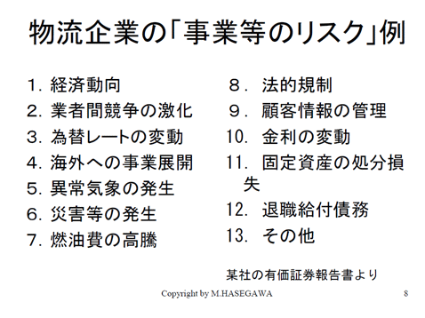 それでは、先ほどお話しました上場企業の物流企業における事業リスクにはどのようなものがあるのか、ある上場企業の有価証券のオプションを見るとこういう事が出ています。