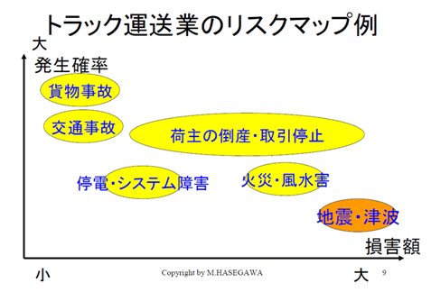 こちらは私が作成した資料ですが、トラック運送業、およびトラック運送業を利用している荷主企業さんにも関連するリスクマップです。縦軸がリスクの確率です。発生する確率が低いものは100年に一度、1000年に一度とかそう言うレベルですね。それで、横軸がそれによって発生する損害額、大きいか小さいかという比較です。