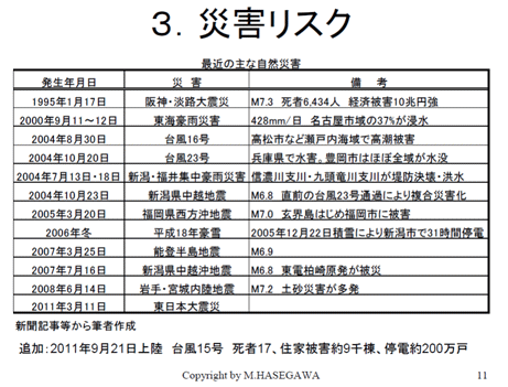 こちらが災害リスクです。1995年の、もう16年も前の阪神・淡路大震災、私もこの時は日本通運の本社にいてどちらかというと後方支援部隊として取り組んでいました。その当時は日本通運本社は、秋葉原にありました。あの頃はそれほど携帯電話が現在のように普及していなくて、応援の車100台を出すにあたって、その運転手に携帯電話を持たせようとして、私たちは手分けして秋葉原の電気街を走り回って計100台の携帯電話を集めた記憶があります。