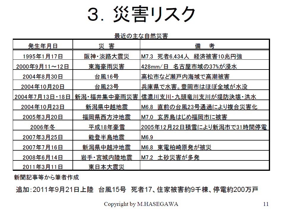 この後追加したのは9月21日の台風15号、17号と、その前の12号、10号です。これにより停電約200万戸ということですが、台風自体はかつての伊勢湾台風と同じような規模です。防災が進んできてそれだけ台風による人的被害は減ってきたのですが、まだまだ家の損害とか停電とかそういったリスクは存在するということです。