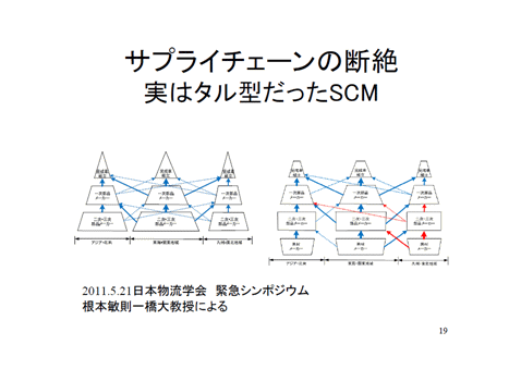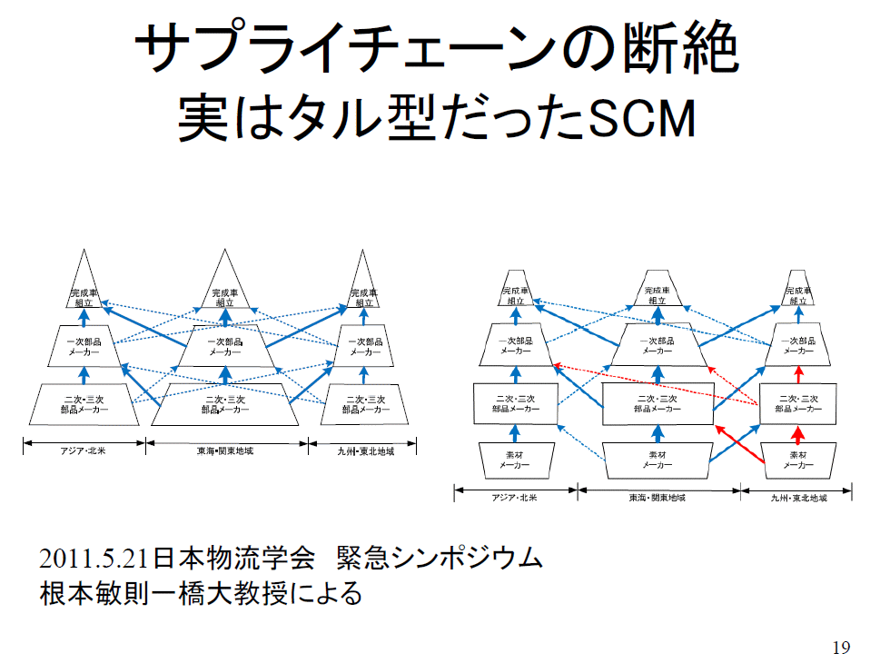 私が所属している物流学会において4月から震災セミナーを2回開いたのです。その時に一橋大学の根本先生がおっしゃっていたのですが、皆さんサプライチェーンというのはトップにこういう会社があって、トヨタさん、あるいはキヤノンさんを例に取ると、その下に下請けメーカー、ティア1(一次下請け業者)、ティア2(ティア1の下請け業者)があって、トヨタさんはティア1で国内400社だそうです。それがあってティア2の会社がたくさん存在するというふうに皆さん思っていたのです。というのは、トヨタさんでもキヤノンさんでもティア2、ティア3の企業についてはほとんど分からないというのが実態です。
