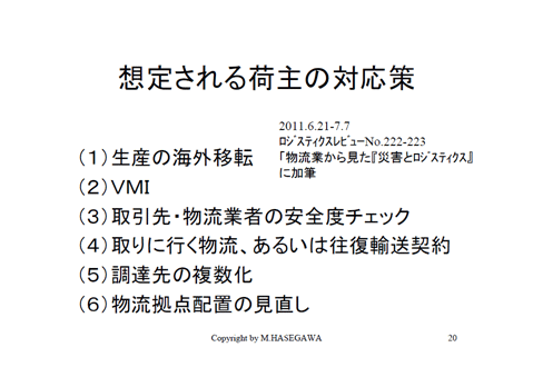 ですから例えば今回の震災で納豆のふたのフィルムがない、あるいはPETボトルのキャップがないというあたりが同じ状況なんですね。この点については、後ほど荷主さんのSCMに対する考え方のところでお話します。