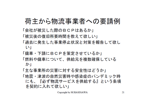 あるいは、「業者や下請けにもBCPはあるのか」、それから燃料不足、燃料がないといっても、燃料について「ガソリンスタンドと複数契約しているのか」、というようなことです。それで最後にいわれるのは、「何があってもうちの貨物だけは運んでください」という言葉がでてきます。