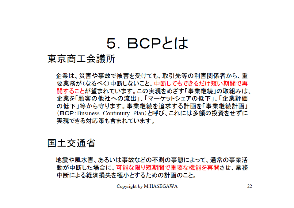 それではいよいよ本題のBCPについてお話ししますが、BCPとは、本日の講演資料の最後に「BCPを作るガイドライン」とか、皆さんこれからBCPを作られる際に役立つと思われるいろいろな参考資料を載せていますが、東京商工会議所では特に中小企業向けに「災害等で中断してもできるだけ短い期間で再開すること」、国土交通省でも、「可能な限り短期間で重要な機能を再開する」、と定義しています。このスライドの赤で強調しているところがBCPのキモ(ポイント)ではないかと思っています。