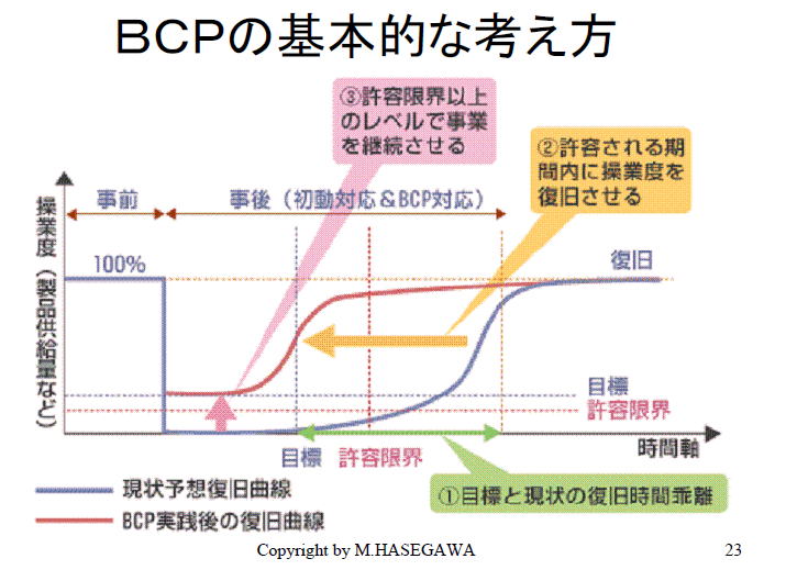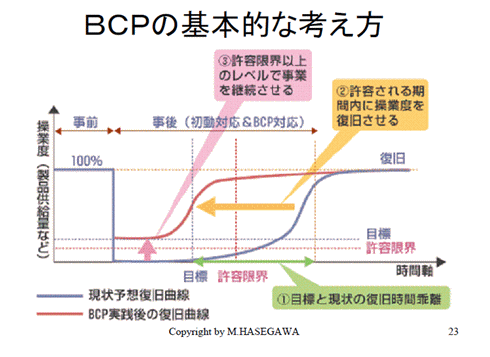 被害を極小化することも、もう一つのキモ(ポイント)です。経済損傷を極小化する、そのために、ここで先手を打っておくことが必要なのです。この復旧期間が「よその会社と比べて長いと顧客をとられてしまいますよ」と言うことです。これが、BCPの考え方なのです。