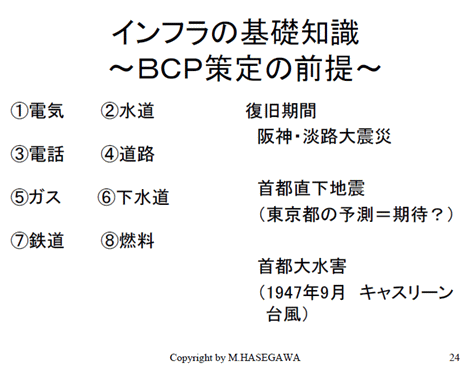 そういう事を前提にBCPをどうするかということなのです。ここに復旧期間と書いてありますが、例えは東日本大震災が参考になるかどうかわかりませんので、阪神・淡路大震災の時ですが、電気は一番長いところで6日間、電話は一番長いところで2週間通じなかったのです。それから水道は一番長いところは90日間ということです。