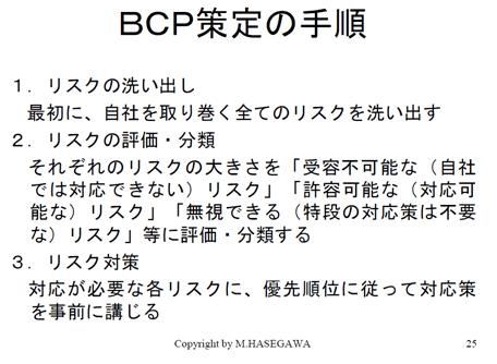 これらについて対応が必要な各リスクに優先順位をつけてそれで対策を作っておく。これがBCP策定の手順だと思います。
