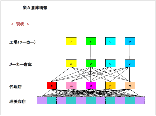 現状の商品の流れは、メーカーの工場からメーカーの倉庫にいき、ディーラー(代理店)さんのそれぞれの倉庫に届けて、そのディーラー(代理店)さんの倉庫から更にサロンさんとかバーバーさんに届けられるのです。それで、一つのサロンさんでは、大体平均して、3社くらいのディーラーさんとお取引があります。ですから、Aというディーラー(代理店)さんで届ける品物をBというディーラー(代理店)さんでも届けている、このような図式です。