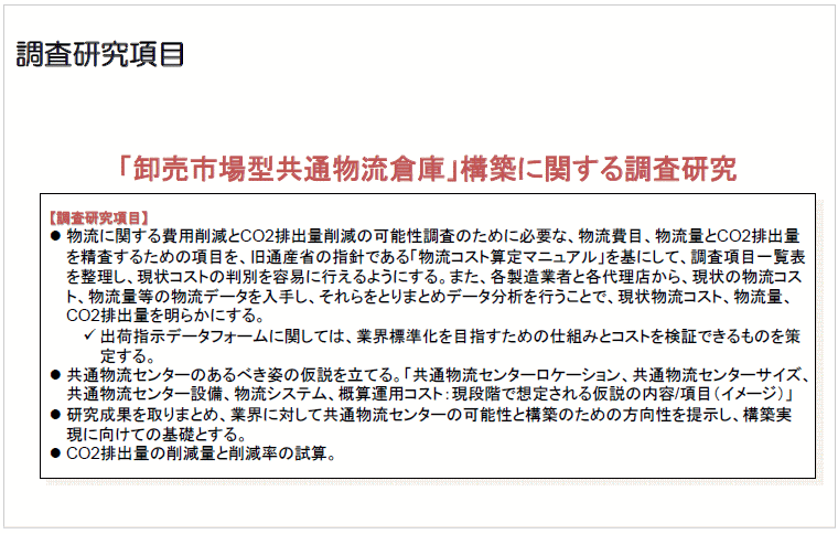 NBBAの加盟企業は、その頃12社でした。その12社に3ヶ月間の出荷明細データ、対象エリアとしては、東京、神奈川、千葉、埼玉の1都3県の出荷明細データを各社から提示していただいて、そのデータをベースに共通倉庫で取り扱う場合、どれくらいのボリュームとどれくらいの出荷頻度になるのかということについてすべて調査・分析を行って、最終報告書という形で完成しました。「楽々倉庫」を実現するには、かなり大きな物流センターが必要になってくるのですが、CO2の削減にも物流の全体の効率化という部分でも大きな効果があるだろうといったものでした。