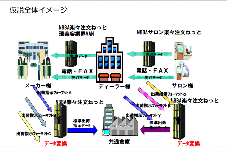 基本的な考え方として、ここに共通倉庫があります。ディーラーさん側はサロンさんから受けた受注を共通の出荷指示フォーマットで「NBBA楽々注文ねっと」に投げると、共通倉庫の中のディラーさんの倉庫へ出荷指示がでます。メーカーに関してはディーラーさんからきた注文を、メーカーは出荷指示として「NBBA楽々注文ねっと」を通して共通倉庫に送ると、この共通倉庫の中でメーカー倉庫からディラーさんの倉庫へ商品の移動が行われるという形です。