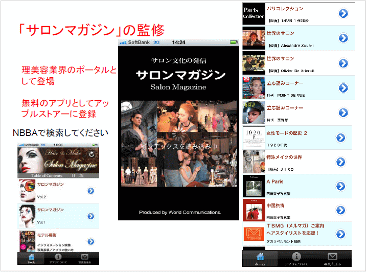 皆さんの中でiphoneもしくはipadをもたれていたら、アップルストアーで「NBBA」で検索いただけると引っかかってきます。無料のアプリです。この中にはパリコレクションの様子とか、世界的に有名なサロンさんのお店の様子ですとか見ることが出来ますし、「POINT DE VUE」というフランスでは結構有名な雑誌が無料で読めるコーナーもあります。業界紙の一社に協力いただいて、この「美容界」という情報も載せていただいています。昔の「VOGUE」の女性モードの歴史も見ることが出来ますし、後は写真集とかもあります。