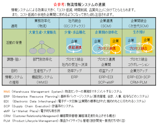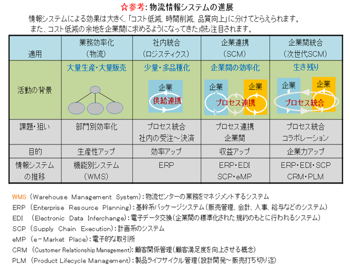 個別の企業によって、業務効率化(物流)、社内統合(ロジスティクス)、企業連携(SCM)、企業間統合(次世代SCM)の導入期、成熟期がマチマチで、業務やプロセスの標準化、規格化が浸透せず、部分最適は達成していますが、全体最適が遅れていることが日本の物流力(&経済力)の足かせになっているものと危惧しています。