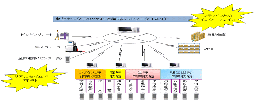 物流センターの作業進捗、入出荷状況、在庫状況、人時生産性などを構内ランで、遠隔地はインターネット経由で顧客、本社、管理部署、営業所などにリアルタイムに必要情報(作業進捗、在庫情報、管理情報など)を提供します。