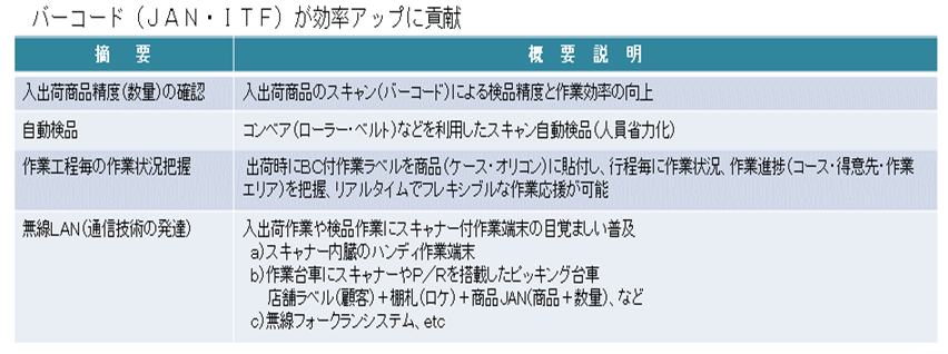 そして、在庫実態を即時正確に把握、適正化すること、店頭(POS)情報から販売動向を把握分析すること、営業、財務(経理)、物流の各部門と在庫情報(在庫数量)を共有化して物流管理を数値化、高度化、経営、製配販の最適化を狙います。