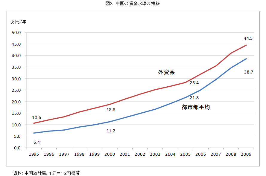 同様に、人件費も図3のように、大都市部を中心に急速に高騰しており、中間管理職クラスは10年もすれば日本の賃金水準と同様に近くなると見込まれるし、一般作業工員でも、15年から20年で同様の傾向に近づくと見込まれる。