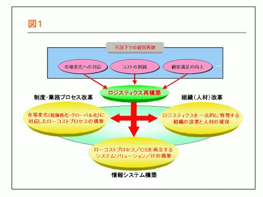 経営再建のためのロジスティクス再構築策としては、①組織(人材)改革、②制度・業務プロセス改革、③情報システム改革の観点から対策を整理する必要がある。まず、組織改革においては、ロジスティクスを一元的に管理する組織の設置と人材の確保が必要である。特に、製造業においては、自社の物流を総合的に理解した組織・人材を有している企業が少なく、この機能補完が再構築実現に必要不可欠である。次に、制度・業務プロセスの改革としては、バブル期に構築された高コスト構造の仕組みを抜本的に見直す必要があり、同時に合理化された仕組みとCSの両立を支える情報システム(ITソリューション)の構築が必要である。そして最も重要なのは、以上の3点を連携して検討し、対策を講じることである。(図1参照)