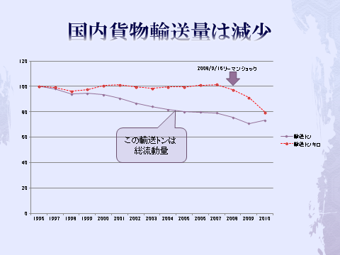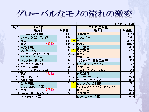 日本国内の物流関連データの推移を分析してみると1991年のバブル崩壊以降、悲観的な数値がほとんどである。それを端的に示している数値が国内貨物輸送量推移であり、そして国際海上コンテナの取扱量推移であろう。前者は輸送トン数で20%以上も減少し、後者も東京港・横浜港・大阪港・神戸港、四港のコンテナ取扱数を合計しても、上海港の半分にも達しないし、釜山港一港にも満たない。1980年には神戸港4位、横浜港13位、東京港18位で釜山港は16位であった。現在では順に49位、40位、27位と大きく凋落し、それに対して釜山港は5位に躍進し20位以下であった上海港は1位になった。
