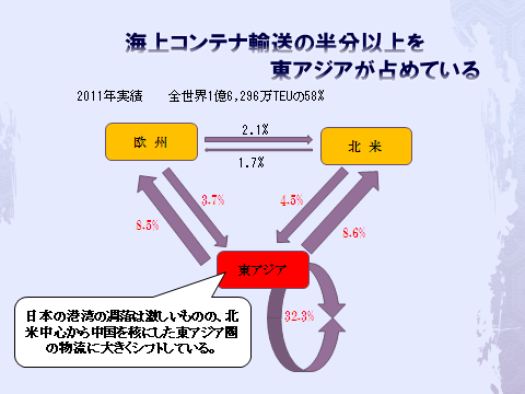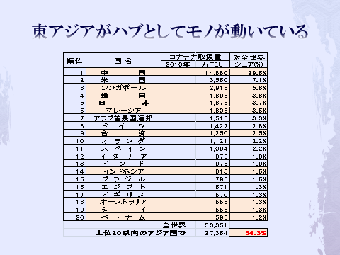 東アジアの国が上位を占めており、国際海上コンテナ輸送は今や東アジアを中心として動いているのがわかる。物流を日本一国として捉えるのではなく、東アジアや東南アジアや極東として捉える必要がある。ボーダーレスからグローバルに使われる言葉が変わったが、国内と海外という2区分ではなく、もっと広域にデータを捉える必要がある。工場立地や物流センター立地も同様で、もっと高所から眺めてボーダーレスに立地を検討する必要がある。欧州連合(EU)では28ケ国(2013年7月現在)と加盟国の拡大に伴い、物流拠点がオランダやベルギーから、より東側のドイツに立地が変化している。
