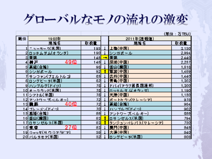 日本国内の物流関連データの推移を分析してみると1991年のバブル崩壊以降、悲観的な数値がほとんどである。それを端的に示している数値が国内貨物輸送量推移であり、そして国際海上コンテナの取扱量推移であろう。前者は輸送トン数で20%以上も減少し、後者も東京港・横浜港・大阪港・神戸港、四港のコンテナ取扱数を合計しても、上海港の半分にも達しないし、釜山港一港にも満たない。1980年には神戸港4位、横浜港13位、東京港18位で釜山港は16位であった。現在では順に49位、40位、27位と大きく凋落し、それに対して釜山港は5位に躍進し20位以下であった上海港は1位になった。