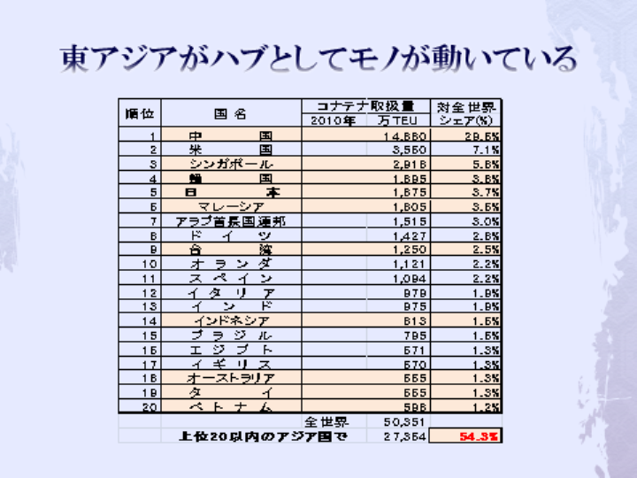 東アジアの国が上位を占めており、国際海上コンテナ輸送は今や東アジアを中心として動いているのがわかる。物流を日本一国として捉えるのではなく、東アジアや東南アジアや極東として捉える必要がある。ボーダーレスからグローバルに使われる言葉が変わったが、国内と海外という2区分ではなく、もっと広域にデータを捉える必要がある。工場立地や物流センター立地も同様で、もっと高所から眺めてボーダーレスに立地を検討する必要がある。欧州連合(EU)では28ケ国(2013年7月現在)と加盟国の拡大に伴い、物流拠点がオランダやベルギーから、より東側のドイツに立地が変化している。