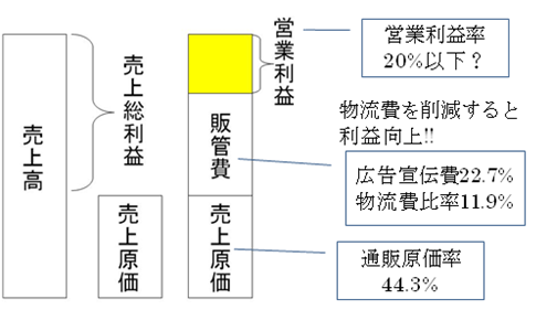 本稿では話をシンプルにするために、通販業界の営業利益率を20%と仮定する。さて、営業利益率20%に対して、物流コスト比率が約12%も発生している。