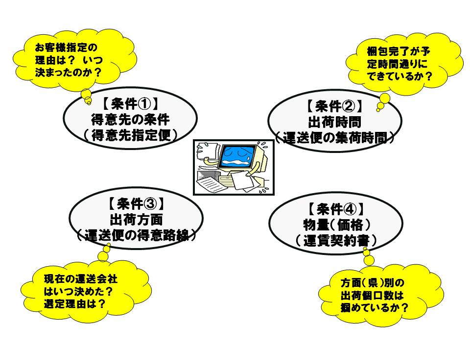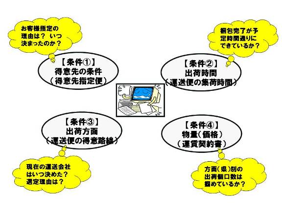 第一の選定条件は、お客様からの運送会社指定(指定便)である。指定便の理由は色々とあるが、「納品時間(時間指定)」「荷扱い」「共同配送」により運送会社を指定している傾向が多い。