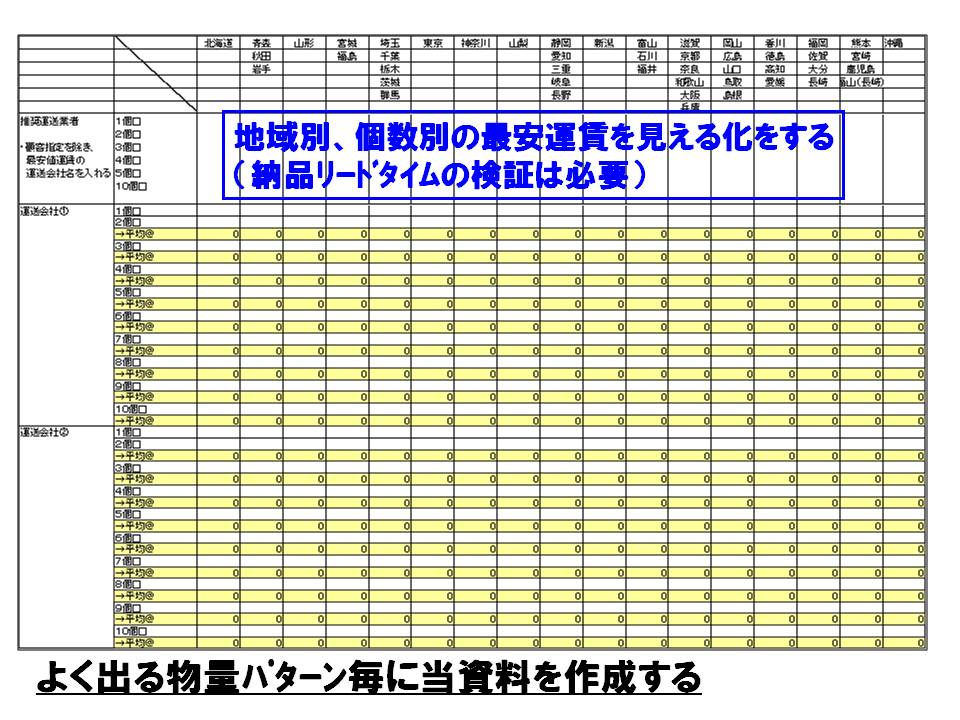 配送担当者は運送会社を得意先サービスと配送運賃で選定する必要がある。配送担当者としては現在使用している運送会社を変更する事は、遅納が原因でお客様からのクレームが発生する可能性があるため非常に勇気がいる。しかし、物流プロジェクトが営業部門も参加する全社プロジェクトであれば、運賃の削減という視点では運送会社の変更も可能である。1個当り数十円の運賃削減であったとしても年間100万円を超える可能性もある。