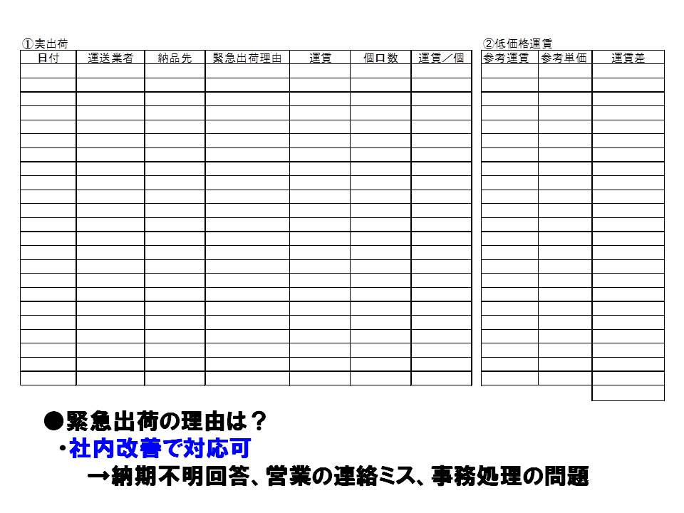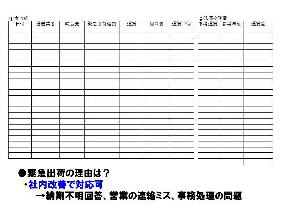運送会社の選定間違いの判断は、運送会社の請求書で検証する。通常は市区町村単位で納品先と物量が記入されているので、簡単に判断できる。結果として高い運送会社を選んだ理由としては、「①運送会社選定基準が無かった」「②得意先指定便」「③緊急出荷」「④追加受注」等が考えられる。