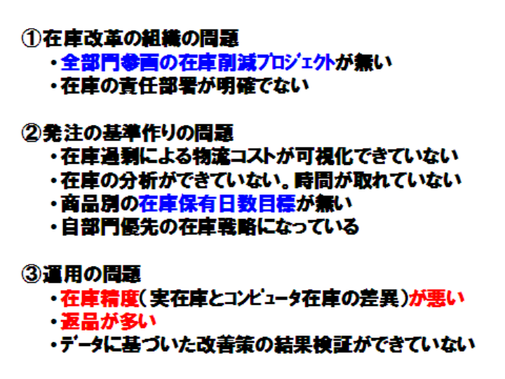過剰在庫削減ができない最大の理由は、「在庫改革を推進できる組織になっていない」ことである。在庫改革は製造部門だけでは抜本的な改善はできない。製造計画で必要なデータは他部門が持っている。「商品別の出荷数の予測」、「商品の終息時期の予測」、「物流コスト」等である。また、小集団活動の弊害(自部門だけでの改善は積極的であるが、他部門がらみの改善はタブー)もあり、製造部門は生産効率重視の製造計画になってしまう企業も多い。これらの必要なデータを全社で共有化し、製造計画をたてるのが在庫改革に必要な組織である。