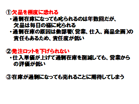 第一は「極度な欠品恐怖」。在庫金額目標を大きく上回ると棚卸時に経営者から製造担当に叱責があるかもしれないが、過剰在庫は製造担当だけの責任では無い(営業部門の営業努力と、商品企画部門の競合に負けない商品開発により在庫状況は大きく変わる)ため、過剰在庫削減が出来ないことにより役職の降格等の大きな責任がかかることはまず無い。しかし、在庫欠品に関しては違う。欠品をすると毎日の様に営業部門や経営者から叱責を受ける。この様な状況であれば、多少の過剰発注をしても無理は無い。そもそも売れ筋商品の欠品は防げるのかという議論をしなければならない。特に新商品の売れ筋は、商品企画時では社内の誰もが予測すらできない。販売数をより正確に予測する場合には、「市場の需要」「競合商品との比較」が必要である。市場の需要はともかくとして、競合新商品情報の事前入手は産業スパイでもしなければ把握できない。