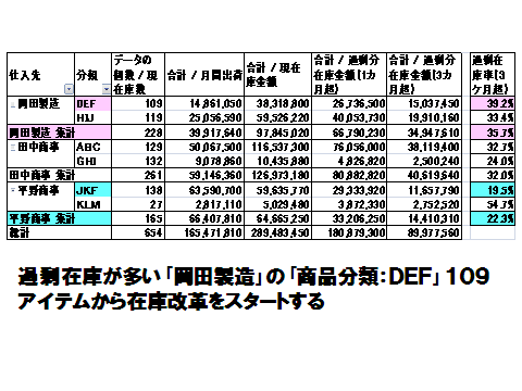 しかし、第一段階では工場(委託工場含む。卸売り業の場合は仕入先に該当)別におおまかな目標設定で良い。A工場は国内生産であるから1カ月、B工場は海外生産であるから3カ月という様に作成する。この基準を単品別に算出し、工場別に集計すると工場別(仕入先別)在庫分析ができる。最初から難しい検討をするのではなく、過剰分在庫金額が多い工場から検討して欲しい。単品毎に過剰在庫商品の発生原因を検討し、「廃盤」「ロット縮小」「営業方法の見直し(情報収集、販売方法等)」等あらゆる方法をプロジェクト全員で検討するのである。この改善の中でうまくいくこともあるが、うまくいかない事も必ず出てくる。うまくいかなかった時は更に改善をブラッシュアップし、改善を推進しなければならない。これがうまくいった状況の後で他の仕入先に展開すれば混乱が最低限で済む。