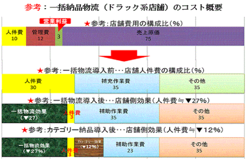 納品先(小売店)の雑多で煩雑な店頭業務を効率化するためケースとバラ(オリコン混載)の複数仕入先の商品をカテゴリー別に集約、カゴ車に混載、トラックへの積み降ろしをドアツードアでスピードアップ、店頭業務の全てを物流拠点(一括納品物流センター)で処理を行い、輸送トラックもリフター付き(4tコンテナ)でハイブリッドに統一、ノンフーズ(70%)はトラック納品回転率の向上と台数削減を目論み、店頭では伝票レス、検品レスで夜間納品にて配達、店内バックヤードも廃止、ゴンドラ(什器)前の通路にカゴ車毎納品、店舗オープン前にパートさんに協力して貰い、品出しを済ませてスッキリした形でお客様を迎えられるようにオープン前の準備に力を入れました。