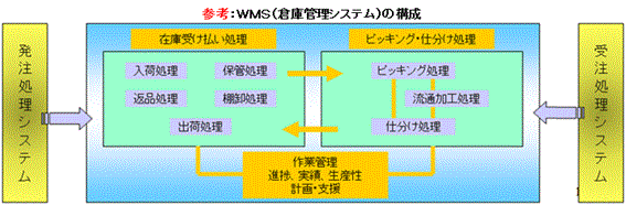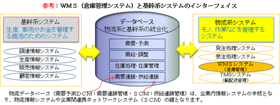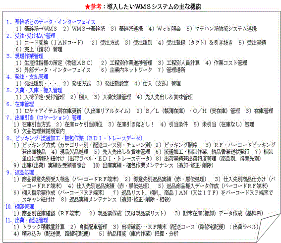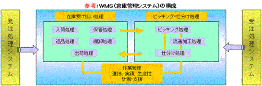 WMSは、物流センターの一連の業務を効率化するための倉庫管理システムです。入出庫管理や在庫管理、作業工程管理などを提供、入荷、検品、ピッキング、梱包、出荷、トレーサビリティなどの各作業に必要な情報を一元的に管理するシステムです。自動倉庫や自動コンベアシステムなど、マテハンシステムとのインターフェイスの提供、バーコードとのリンケージ、RFIDを応用したシステムなどがあります。WMSは、物流部門のみならず、営業部門、企画部門、関連部門や関係者が在庫や作業状態をいつでも見られること(見える化)が求められています。また、顧客(納品先やエンドユーザー)にも高い在庫精度を提供することが不可欠な環境条件(インターネット検索、ネットビジネス、etc)になってきています。WMSの導入を機に実務作業、SCMなどの物流ニーズを支援する様々な機能を持つこと、入出庫による在庫更新、作業状況をリアルタイムに把握すること、インターネットでWMSの在庫データの照会ができること、在庫のミニマム化、欠品を生じさせず、納品リードタイムの短縮が企業競争力のポイントになっています。さらに、コンピュータ在庫と実在庫に差異が生まれないよう、日々の努力と共にWMS(実在庫)で基幹系(帳簿在庫)をサポート(棚卸の簡略化の実現の)することが重要な使命と心すべしです。WMSには、入庫ミスやピッキングミス、誤出荷をしないシステムづくりが必須です。拠点の在庫精度は、作業だけでなく営業活動、製造、購買活動にも影響を与えます。ネットビジネスが伸びている中での強力な支え手になるのは、正確な在庫です。