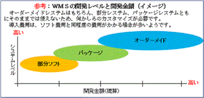 物流拠点内で必要とする機能(現場作業)を網羅していること、コストがかかるが物流現場の作業生産性と精度を高められる業務要件に合わせたカスタマイズが必要です。さらに、自社の個々の作業をサポートするカスタマイズ率は40%以上必要と言われています。導入システムには、大別するとオーダーメイド(カスタムメイド)システム、パッケージシステム、部分システムなどがあります。オーダーメイド(カスタムメイド)システムは、在庫管理システムや入出庫システムなどの定番のシステムだけではなく、自社の特長、ビジネススタイル、商慣習を損なうことなく、業務を支援する仕組みを作り上げることが出来る点がオーダーメイドで、システムを開発する最大のメリッ トです。使い勝手は良いのですが、開発工数が多くなり、開発費用が高価になります。パッケージシステムは、メリットも多いのですが、決められた機能しか使えないため、競争力を発揮する業務プロセスがある場合は、それが死んでしまう可能性があります。 パッケージと独自開発のメリット/デメリットをよく検討し、システムの選択をすることをお勧めします。入出庫、検品、棚卸などの機能は揃っているが商品の特性、独自の機能を活かしたい場合は、カスタマイズが必須になると考えます。 機能追加などの導入費を合わせるとオーダーメイドと比較すると導入コストが大きくなることもあります。部分システムは、入出庫・検品・棚卸・ラベル印刷など、物流センター業務の主要機能だけを分離したソフト開発です。他システムとの連動を考えた場合、拡張性が悪く、長期使用には向いていない場合が多く見受けられます。
